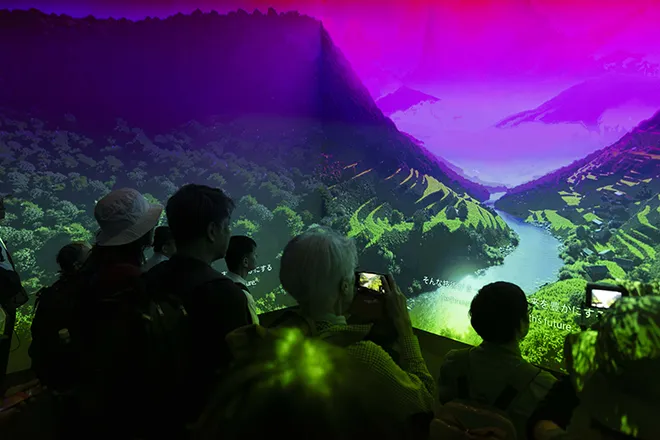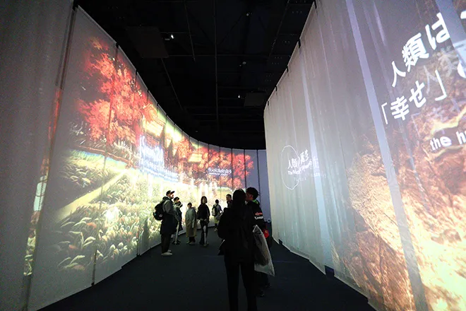 高さ5m、長さ92m、3層紗膜スクリーン✕2面の映像で囲まれた、時空を超える「カービングビジョン」。「Society 5.0って何だろう」をキーワードに、人類が誕生してから、社会が形成され、成熟し、Society 5.0の世界へ。過去から未来につながる壮大な物語を“幸せ”の観点から見てみましょう。