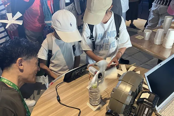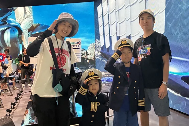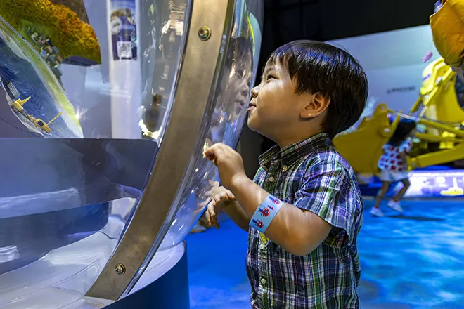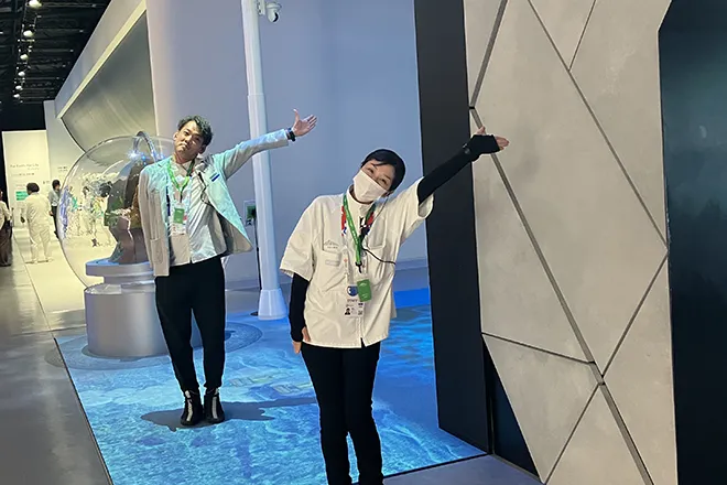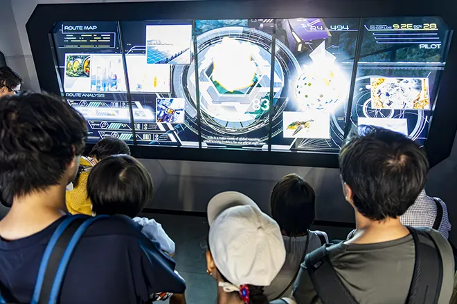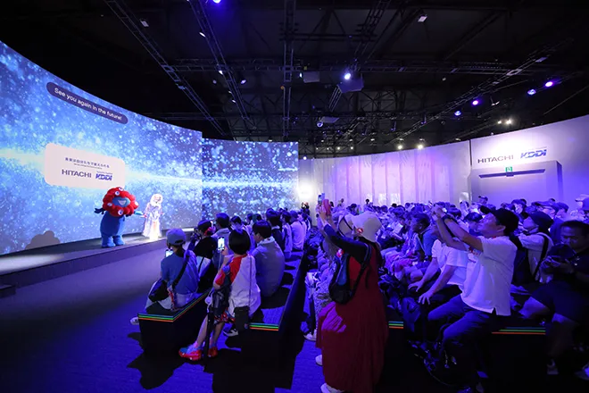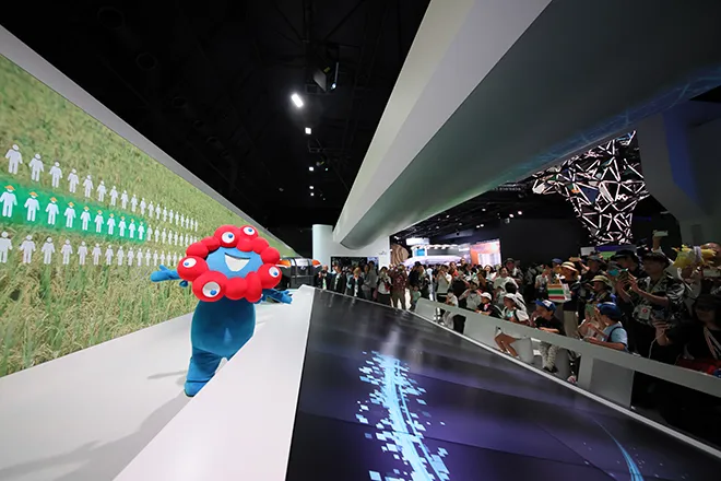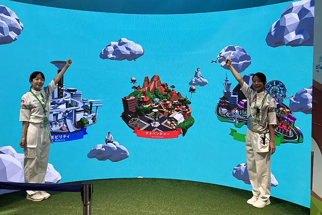 IHIの展示は、「不思議な空飛ぶキューブ」に乗って、海の中から宇宙、そしてミクロの世界を駆け抜ける、ドキドキの没入型映像体験。地球と生命の源である水の循環と、これからの豊かさの源となるクリーンエネルギーの循環が続く未来へと旅に出ます。